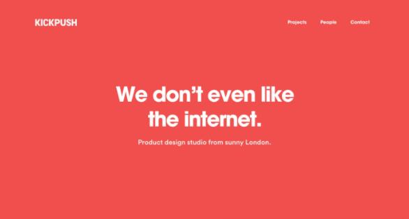 鮮艷的紅色,扁平化的網(wǎng)站設(shè)計,微妙的動效,都可以看出這個名為Kickpush 的開發(fā)團隊在設(shè)計和開發(fā)上的豐富經(jīng)驗,而他們這個作品集網(wǎng)站最突出的還是他們反諷的幽默感:“我們不喜歡互聯(lián)網(wǎng)。我們來自陽光明媚的倫敦?!?/p>